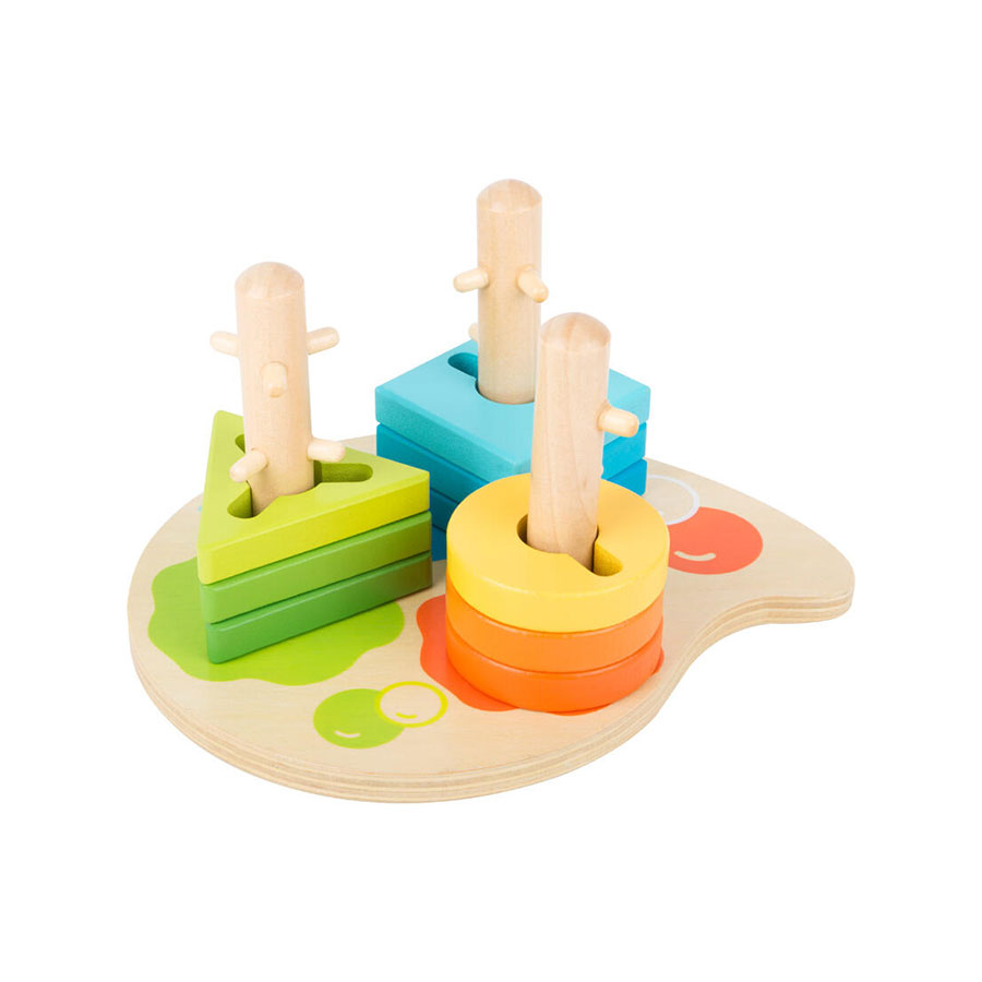Ein farbenfrohes Motorikspiel! Hier versuchen kleine Motorikkünstler, geometrische Formen aus Holz zum passenden Farbfleck auf der Malerpalette zuzuordnen. Eine knifflige Angelegenheit, bei der die Formen so gedreht werden müssen, dass sie die Hindernisse auf den Holzstäben überwinden. Mit flexiblen Stäben.